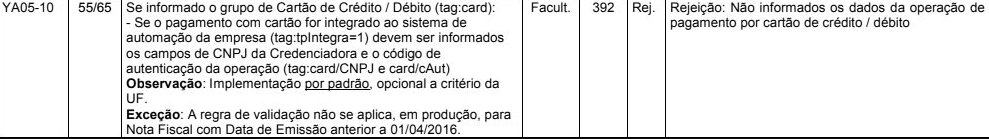 Quando for emitida uma Nota Fiscal com o Grupo de Cartões (tag: pag / card) e o Tipo de Integração (tag: card / tpIntegra) para o pagamento for igual à "1 - Pagamento integrado com o sistema de automação da empresa (Ex.: equipamento TEF, Comércio Eletrônico) e não for informado os campos CNPJ e cAut dentro do Grupo de Cartões, haverá "Rejeição 392 - Não informados os dados da operação de pagamento por cartão de crédito / débito".