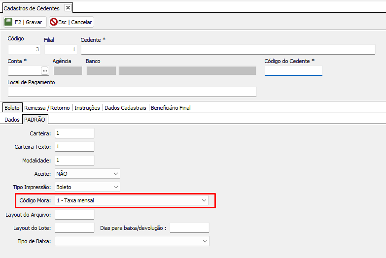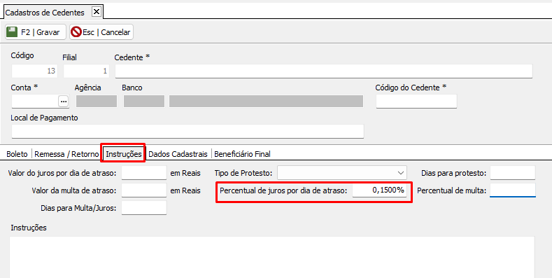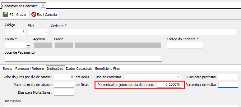 JUROS MENSAL: Para calcular o juros mensal, e necessario ir também na aba: Gestores>Financeiro> Banco> Cadastro de Cedente, e configurar da seguinte forma: