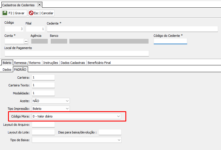 1° Forma:JUROS POR DIA: Para calcular o juros diario no boleto e necessario configurar na seguinte aba: Gestores>Financeiro> Banco> Cadastro de Cedente.