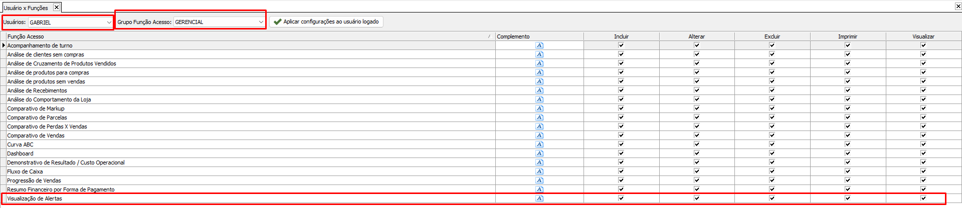 Segurança > Usuários > Usuários x Funções de Acesso.