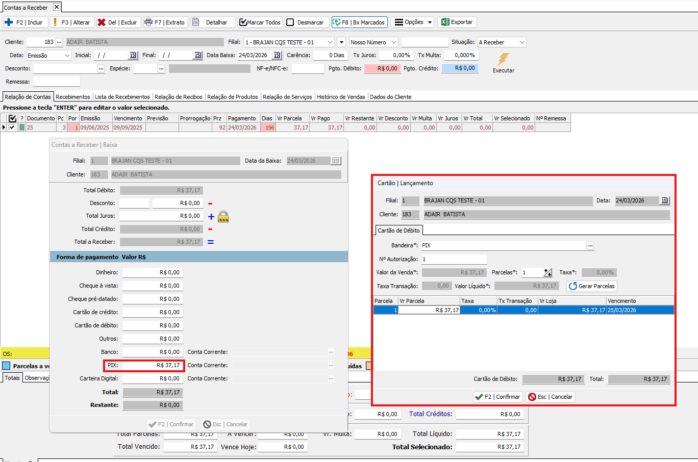 No Contas a Receber, ao realizar a baixa de uma parcela utilizando a forma de pagamento PIX, o sistema irá abrir automaticamente a tela de lançamento de Controle de Cartão de Débito.
