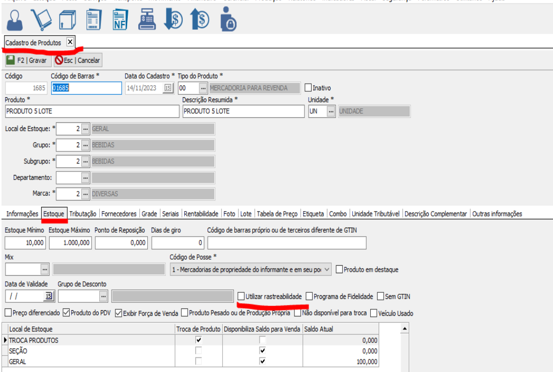 Para visualizá-las, acesse "Estoque", selecione "Cadastro de Produto", clique em "Alterar", vá para a guia "Estoque" e marque a opção "Rastreabilidade" no checkbox.