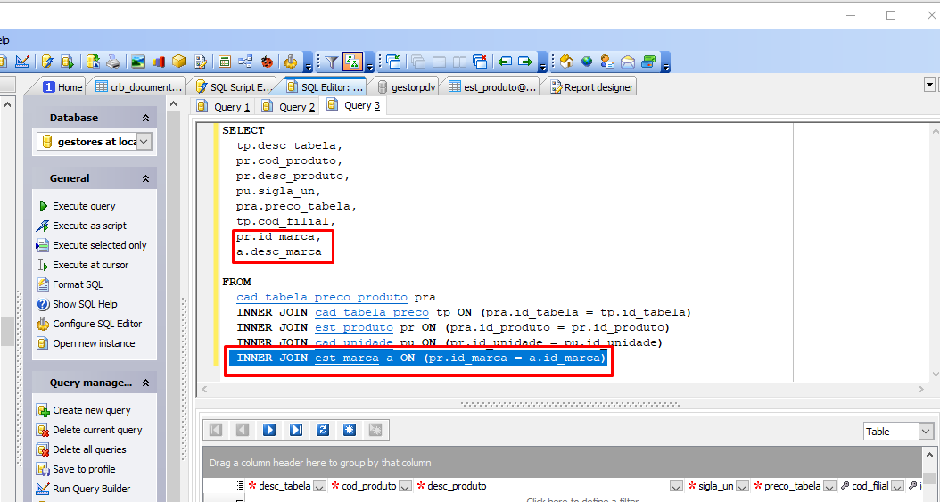 Em seguida, necessita-se criar um Inner Join (INNER JOIN é uma cláusula que permite a junção entre duas ou mais tabelas, desde que hajam entrelaçamento entre todas) com isso, criou-se INNER JOIN est_marca a ON (pr.id_marca = a.id_marca)