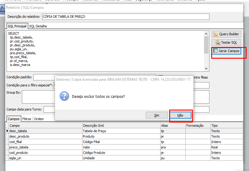 Em seguida, clique em Gerar Campos e selecione "Não", para criar os campos sem apagar os anteriores.