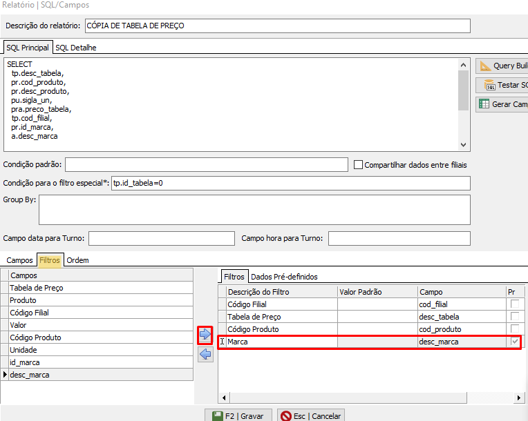 Após em Filtros, faz-se necessário incluir o campo "des_marca" para se tornar um filtro. ( Exemplo de visualizar o campo nome ex : "Marca";