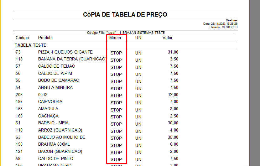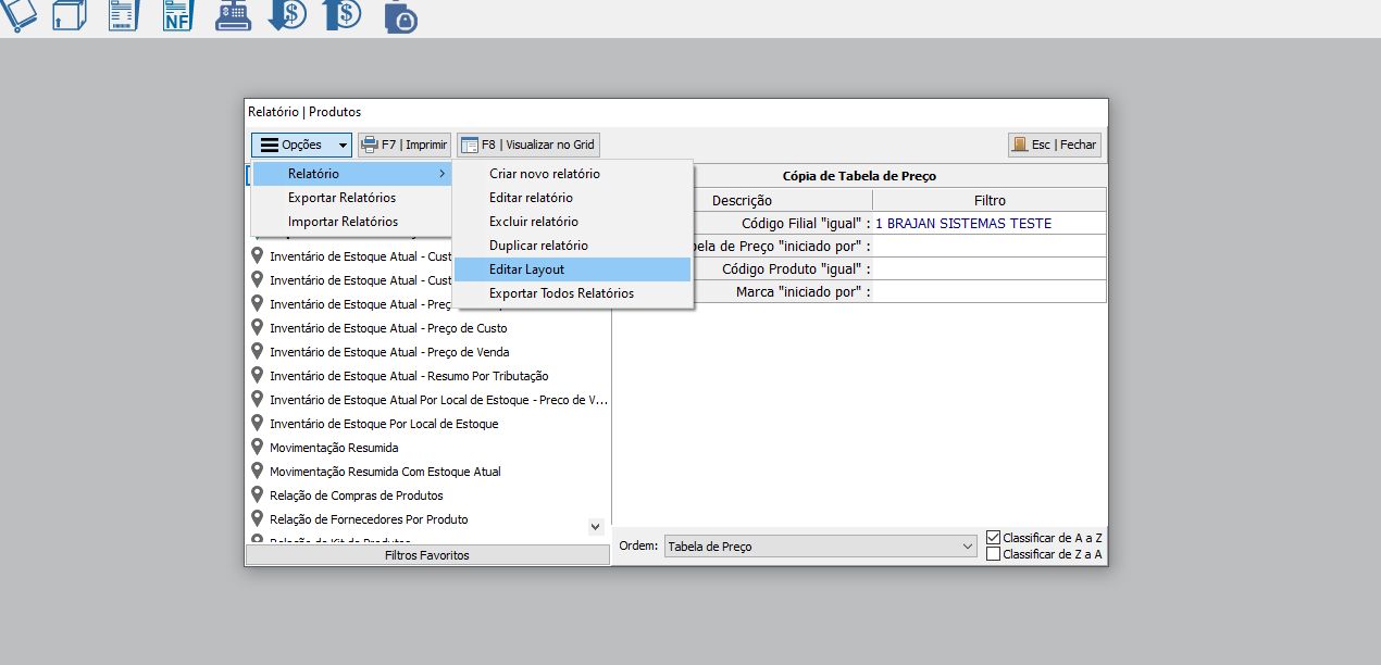 EXEMPLO: Relatórios > Produtos > Tabelas de Preço.