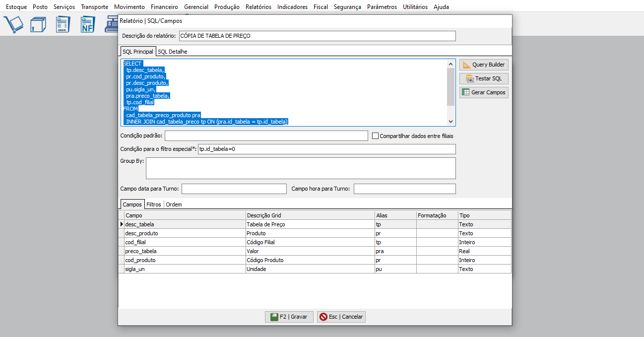 Após duplicar o relatório para que seja possível realizar a edição, em Opções > Editar Relatório -> torna-se necessário copiar todo o SQL Principal;