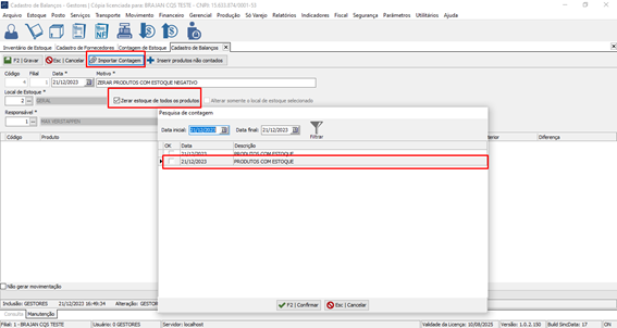 *Muito importante, marcar opção de Zerar estoque de todos os produtos, pois assim serão zerados o estoque dos produtos não presentes na Contagem, ou seja, produtos sem estoque ou negativos.