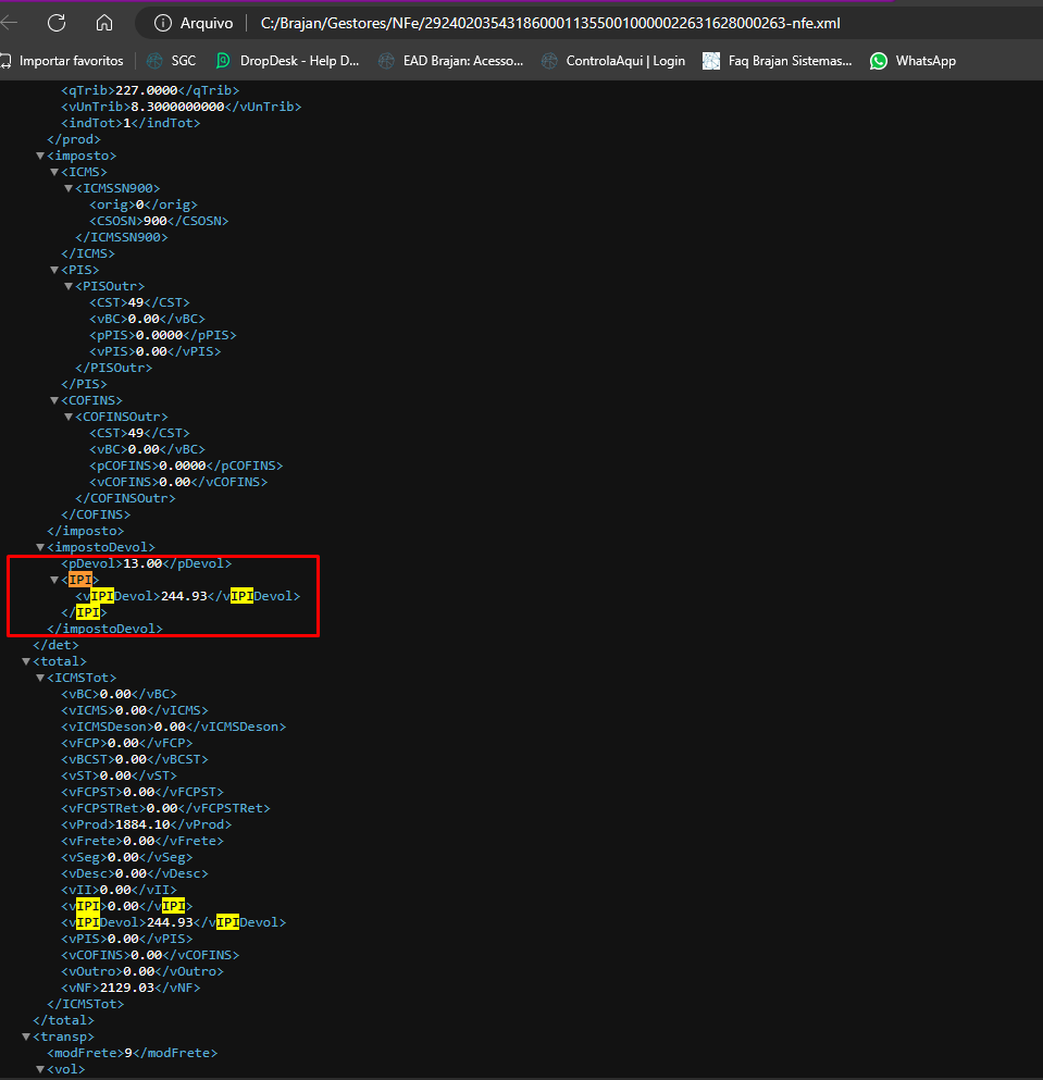 ➡️ O valor do IPI devolvido deve constar no XML no grupo IPI, mesmo que: