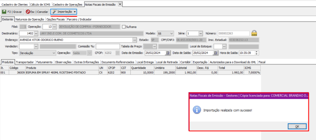 ✔ Manter base, alíquota e valor do IPI conforme a nota original.