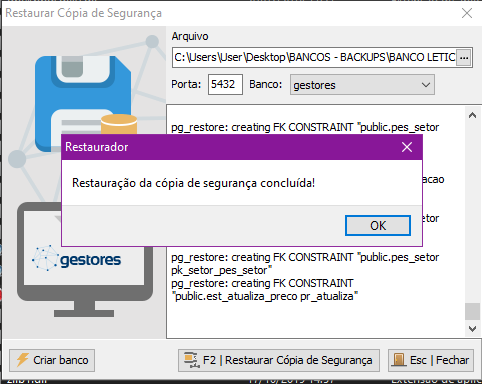 Contudo, poderá abrir o sistema que foi realizado a restauração, sendo possivel realizar a rotina para todos os sistemas (Gestores, Gestor PDV e SincData) apenas modificando o caminho do arquivo e o nome do banco.