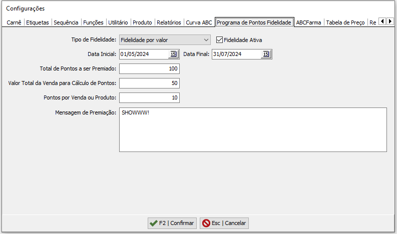 Mensagem de Premiação : A mensagem que o Cliente poderá criar para que apareca em tela ou impresso caso o Cliente informado na venda tenha atingido a quantia da premiação.