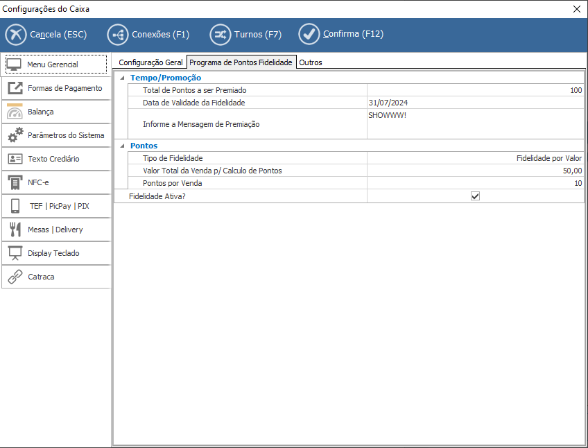 CONFIGURAÇÕES DO CAIXA > MENU GERENCIAL > PROGRAMA DE PONTOS FIDELIDADE