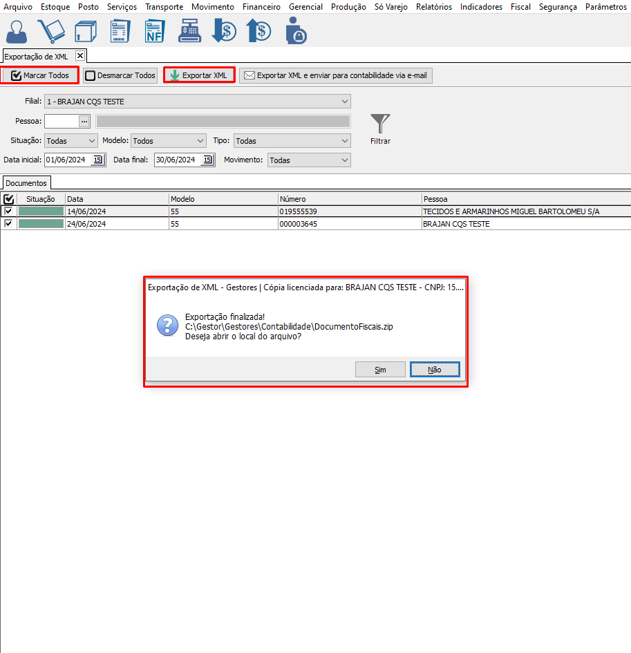 2° Selecionando o período e realizando a exportação os arquivos irá para o caminho criado.