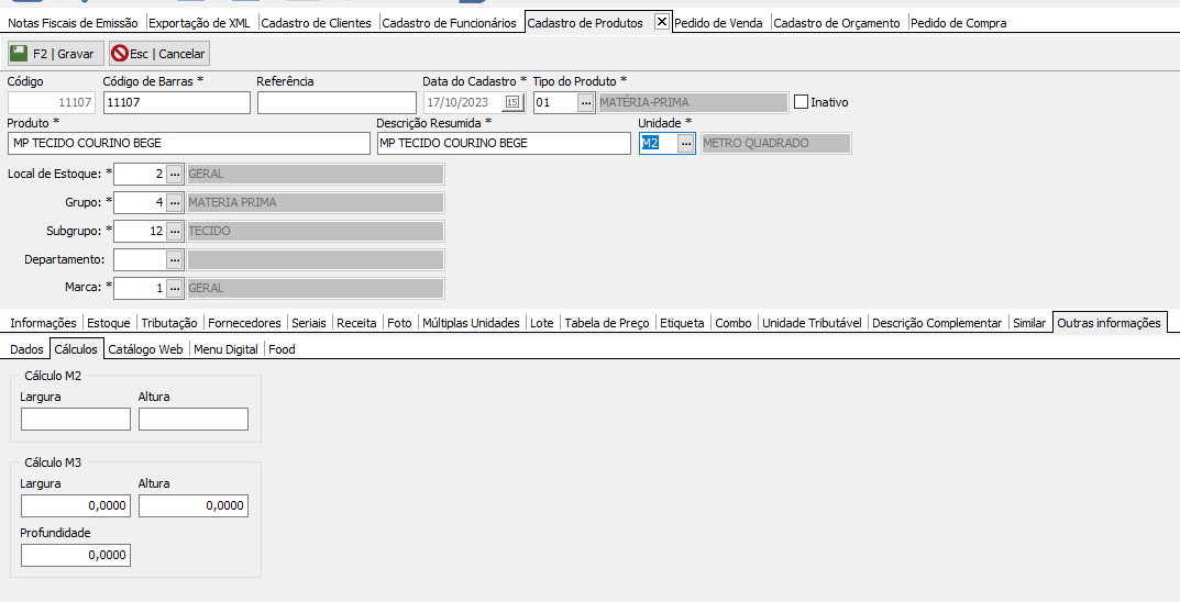 E dentro da tela de Cadastro de Produto, lá em Outras informações>Calculo, o cliente consegue já deixar pré determinado a altura e largura do produto.