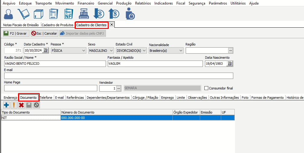 Para acertar faz-se necessário entrar no cadastro do cliente em documentos NIT (Número de Identificação do Trabalhador) e preencher.
