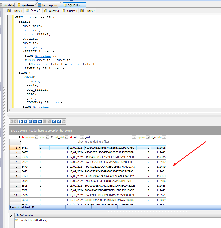Após isso vai aparecer em tela as vendas duplicadas desta forma abaixo: