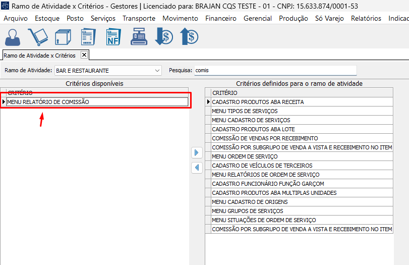 "MENU RELATÓRIO DE COMISSÃO" deve está ativo no Ramo de Atividade
