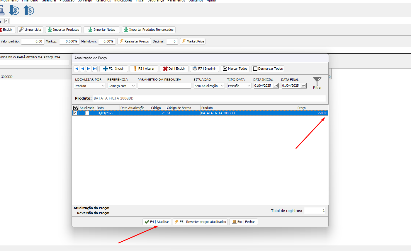 Abaixo estão as imagens que ilustram os procedimentos a serem seguidos caso o parâmetro esteja desmarcado. Nessa situação, é necessário realizar a rotina descrita para atualizar o preço do produto.