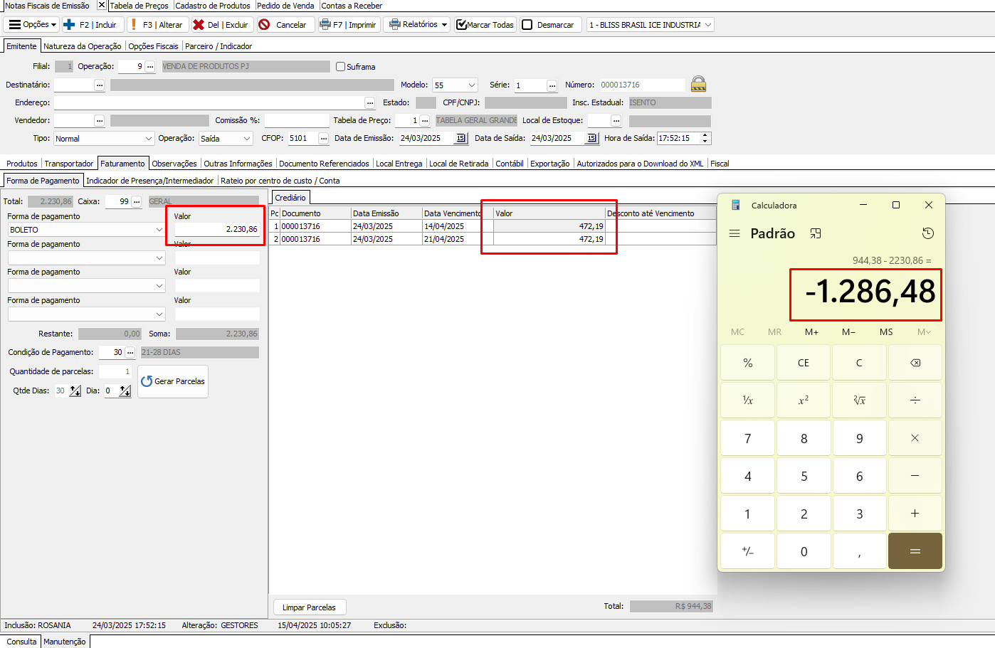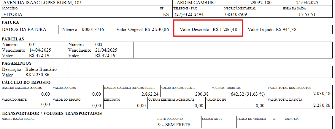 Como no exemplo abaixo, o boleto foi gerado. Contudo, o valor desses boletos não corresponde ao valor da nota. Por isso, foi gerado esse desconto: