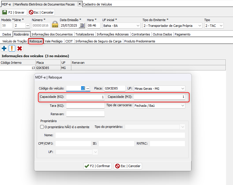 Para a correção do erro mencionado anteriormente, é necessário realizar o preenchimento adequado dos campos obrigatórios destacados abaixo. Somente após o correto preenchimento dessas informações será possível validar e transmitir o Manifesto Eletrônico de Documentos Fiscais (MDF-e) com sucesso: