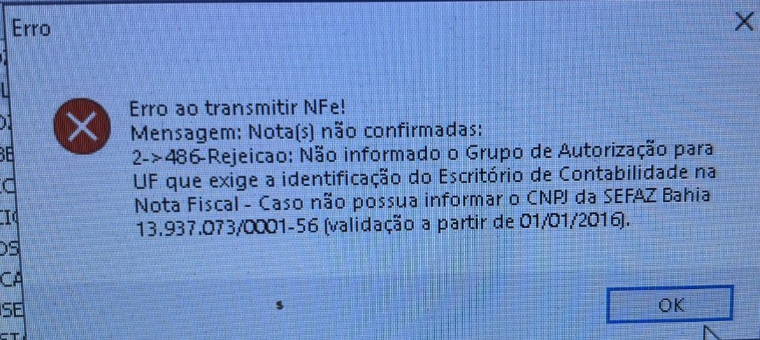 Alguns estados, por exigência da SEFAZ, requerem a informação do escritório de contabilidade. Caso a empresa emitente não possua um contador responsável, deve ser informado o CNPJ da própria SEFAZ. No caso da Bahia como mostra no erro , o CNPJ a ser utilizado é 13.937.073/0001-56.