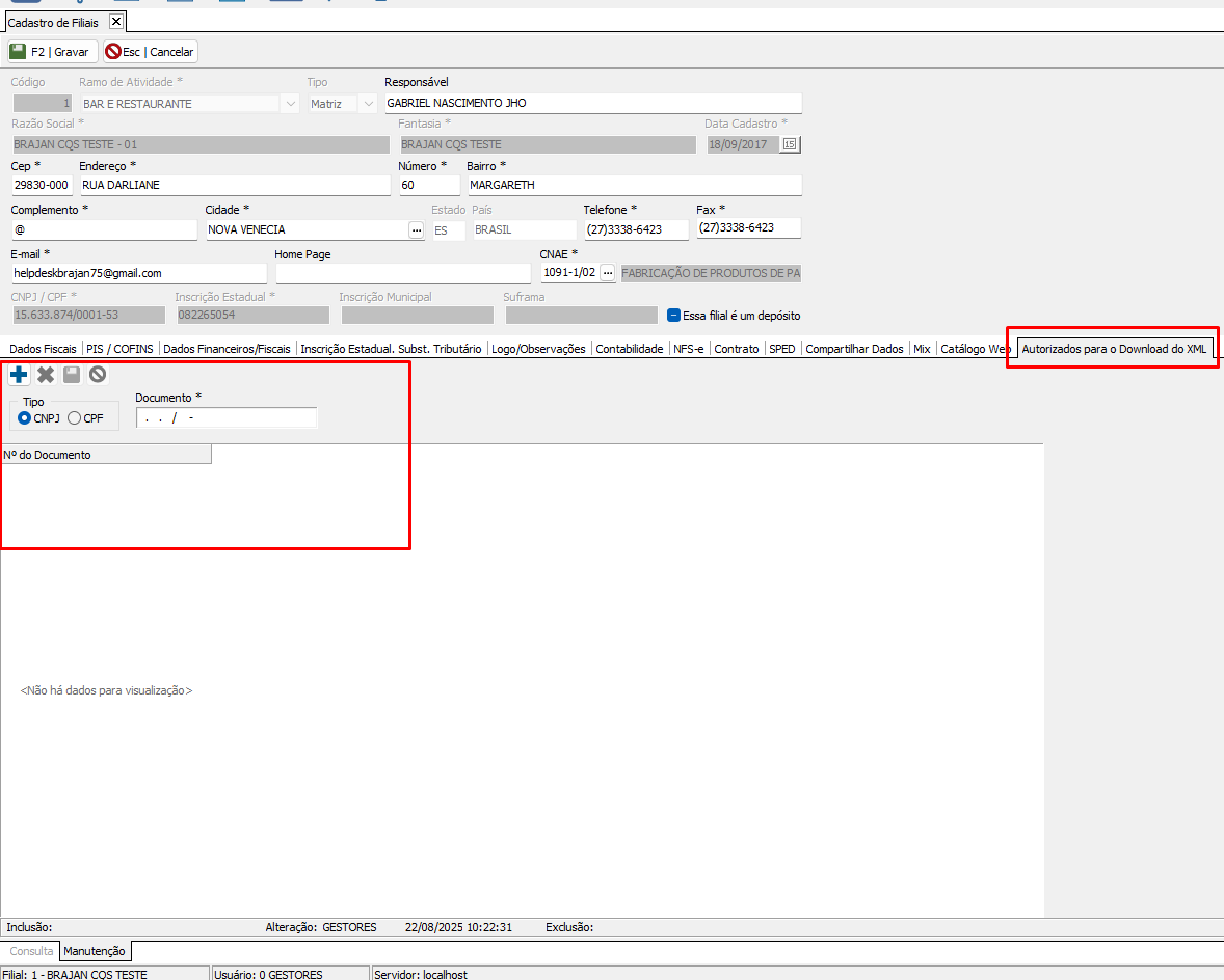 Deve ser preenchido o CNPJ da SEFAZ em Arquivo > Filiais > Autorizados para download do XML.