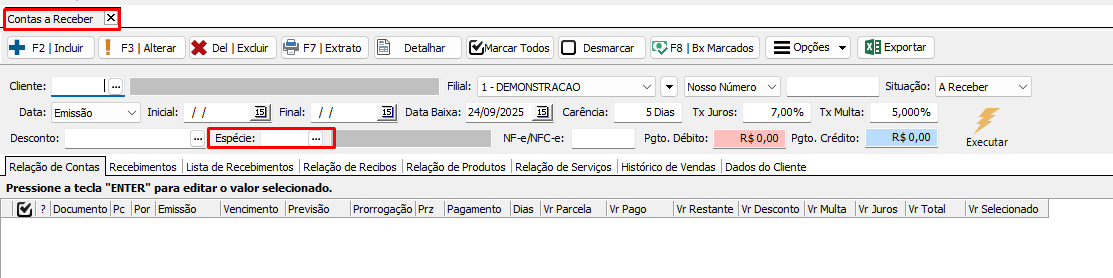 No Financeiro > Contas a Receber foi incluído o filtro espécie. Para que o recurso funcione corretamente, é necessário informar previamente o cliente.
