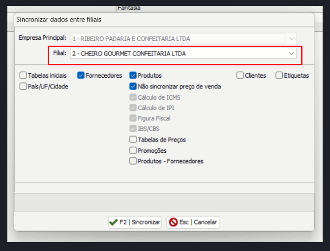 Para isso, basta marcar as opções de sincronismo desejadas na filial, selecionando quais cadastros deverão ser copiados para outra empresa.
