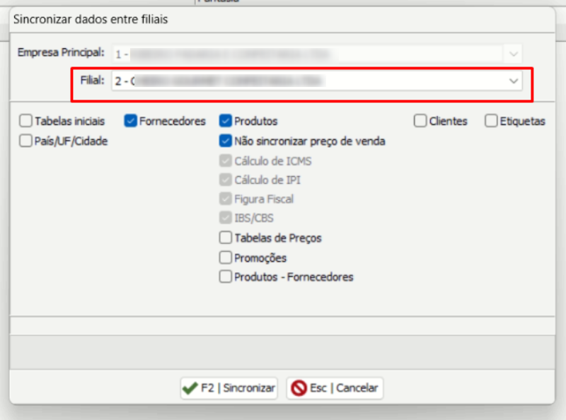 Para isso, basta marcar as opções de sincronismo desejadas na filial, selecionando quais cadastros deverão ser copiados para outra empresa.