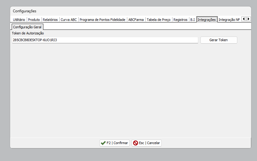 5°: Depois, no Gestores, vá em Utilitarios>Configurações>Integrações. Lá você deverá gerar o token para poder validar as informações na sua maquina.