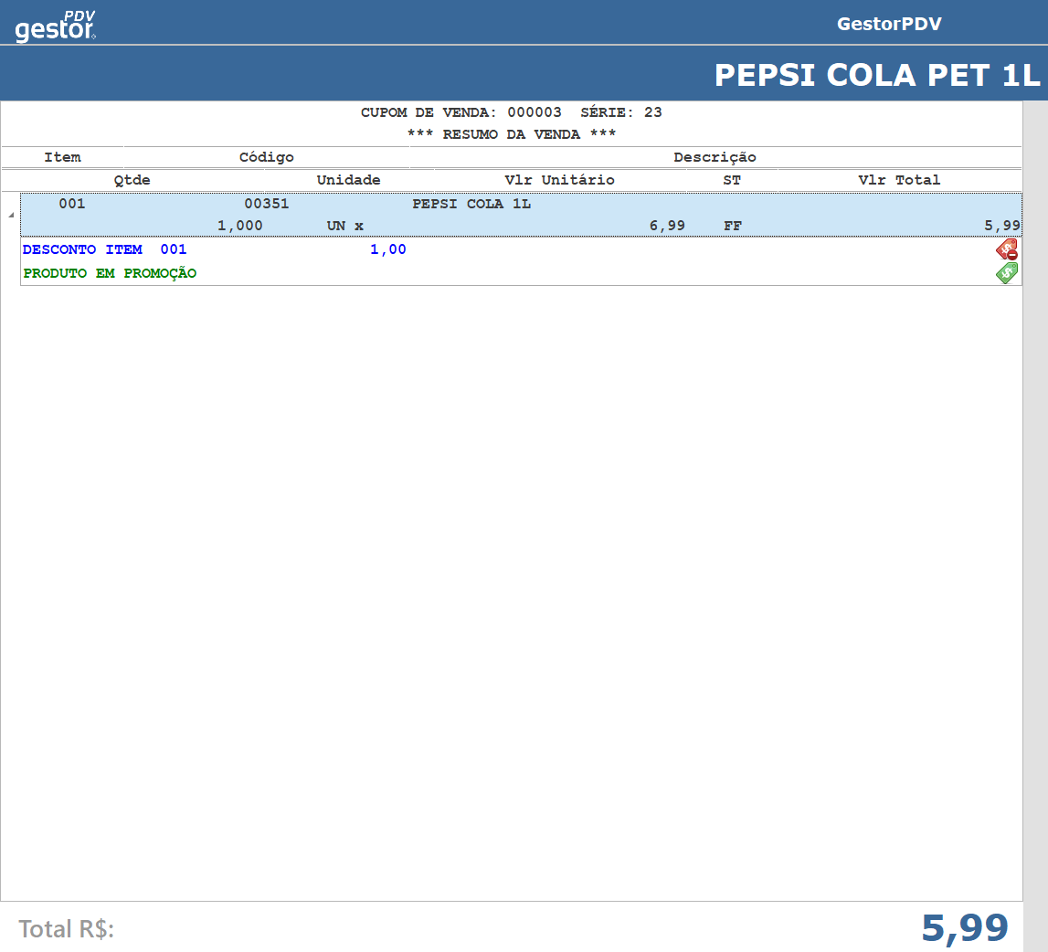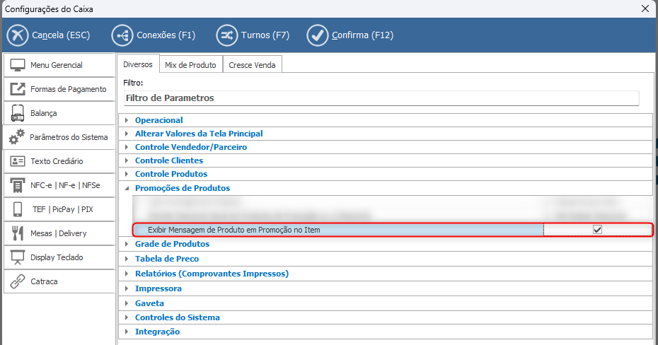O parâmetro “Exibir Mensagem do Produto em Promoção no Item” define se o sistema irá mostrar uma mensagem indicando que o produto está em promoção diretamente no item da venda no PDV.