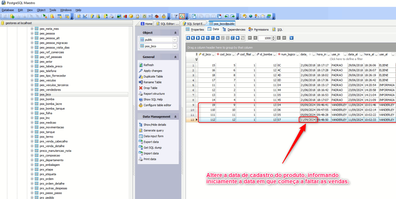 - Na tabela correspondente, altere a data de cadastro do produto que está trazendo parte das vendas, para o dia inicial que falta as devidas informações: