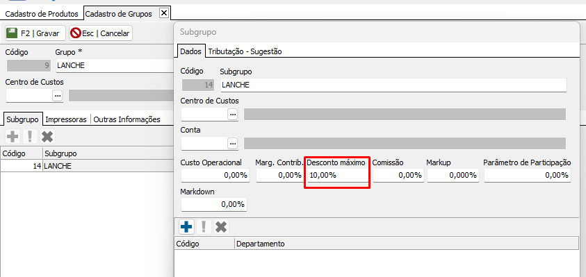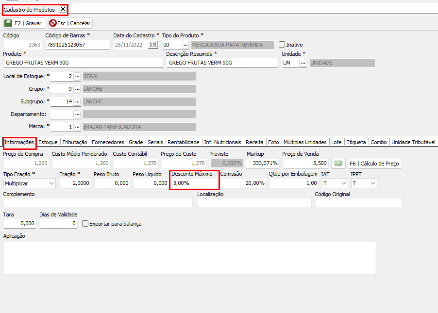 - Cadastro de Produto > desconto máximo