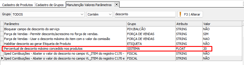 O sistema permite definir o desconto máximo em três níveis: