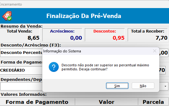 O controle de Desconto Máximo permite limitar o valor de desconto que pode ser aplicado nas vendas, garantindo: