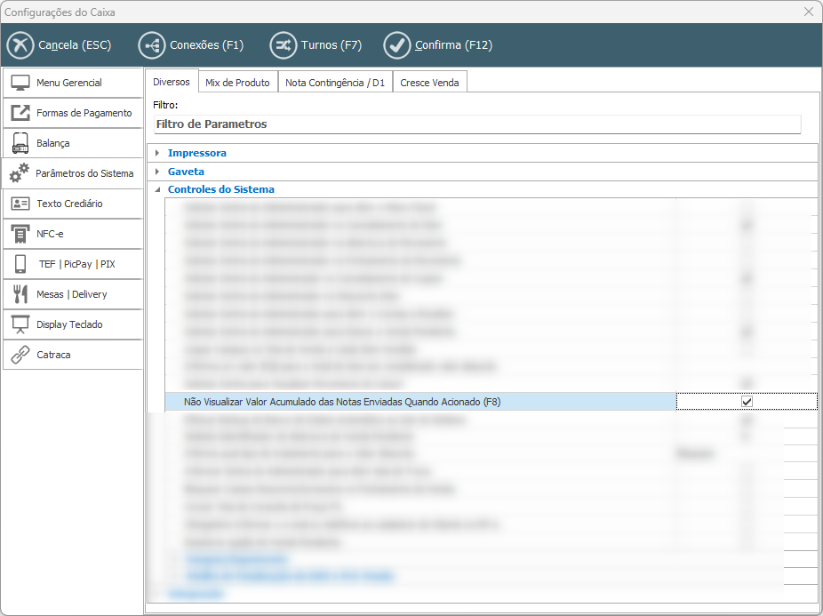 Para ocultar o valor total acumulado das notas enviadas ao utilizar o atalho F8.