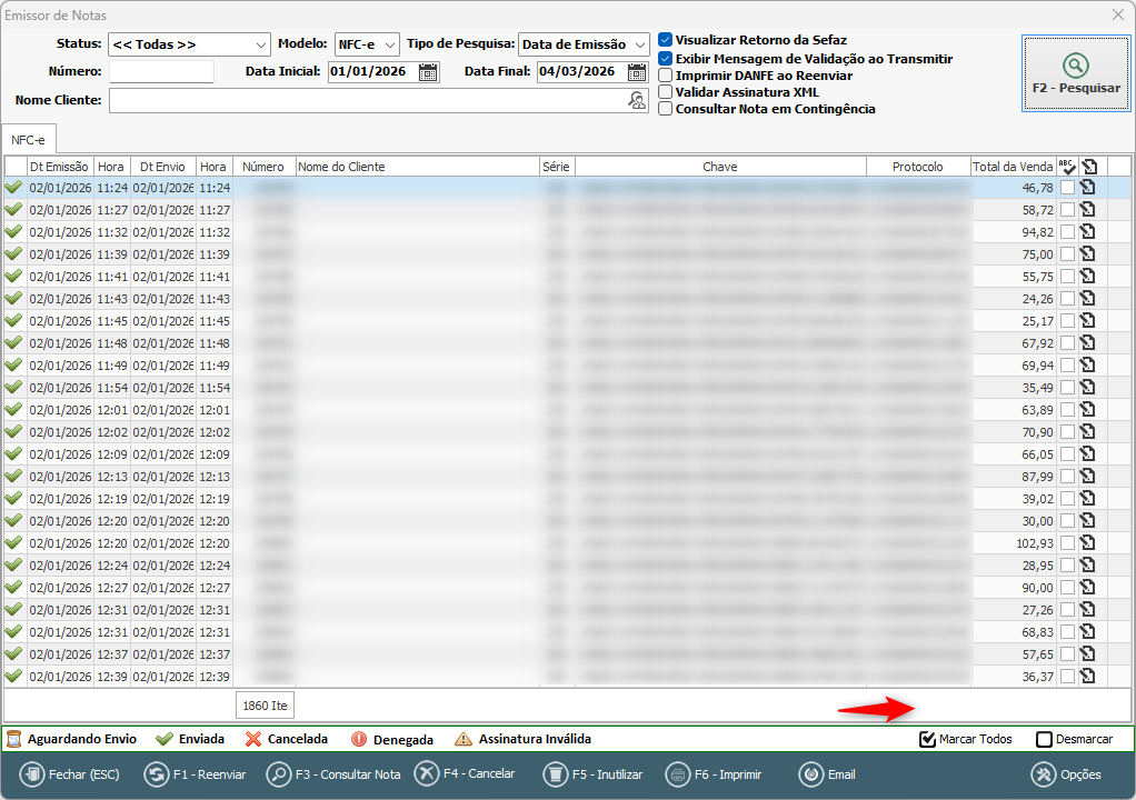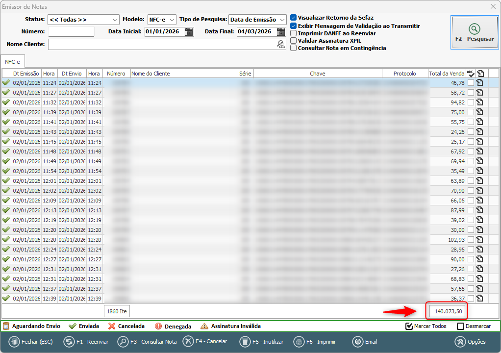 Ao pressionar F8, o sistema exibirá as notas enviadas, porém sem demonstrar o valor acumulado ( Valor total ).