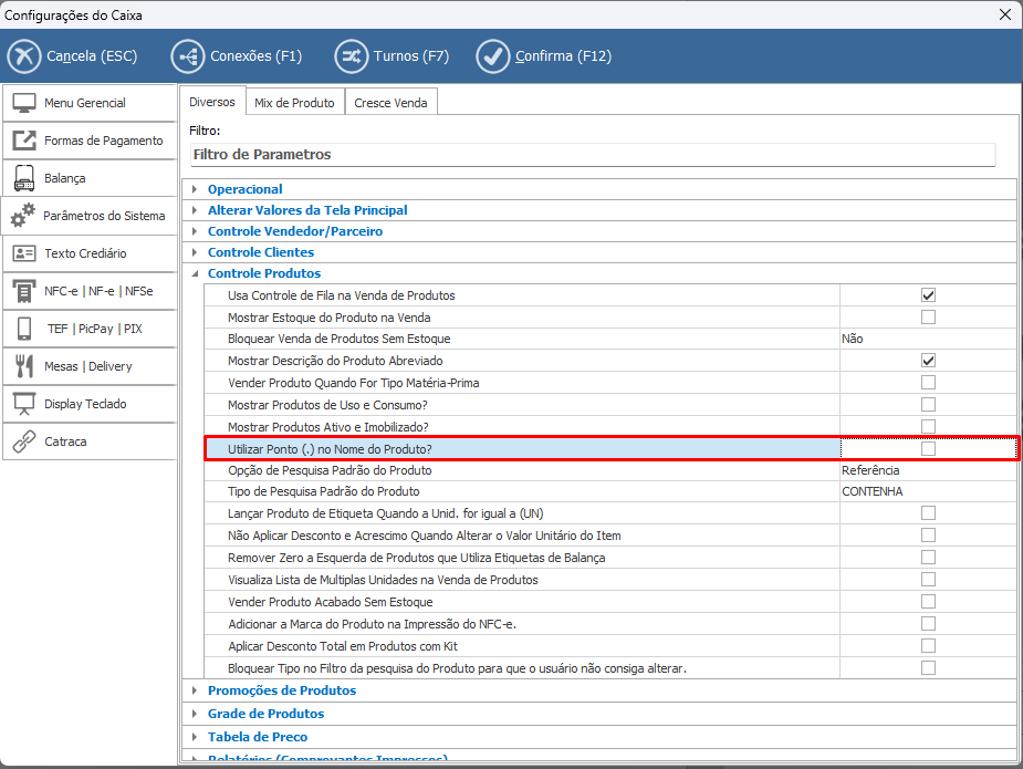 Define se o sistema permitirá a utilização do caractere ponto (.) na descrição/nome do produto.