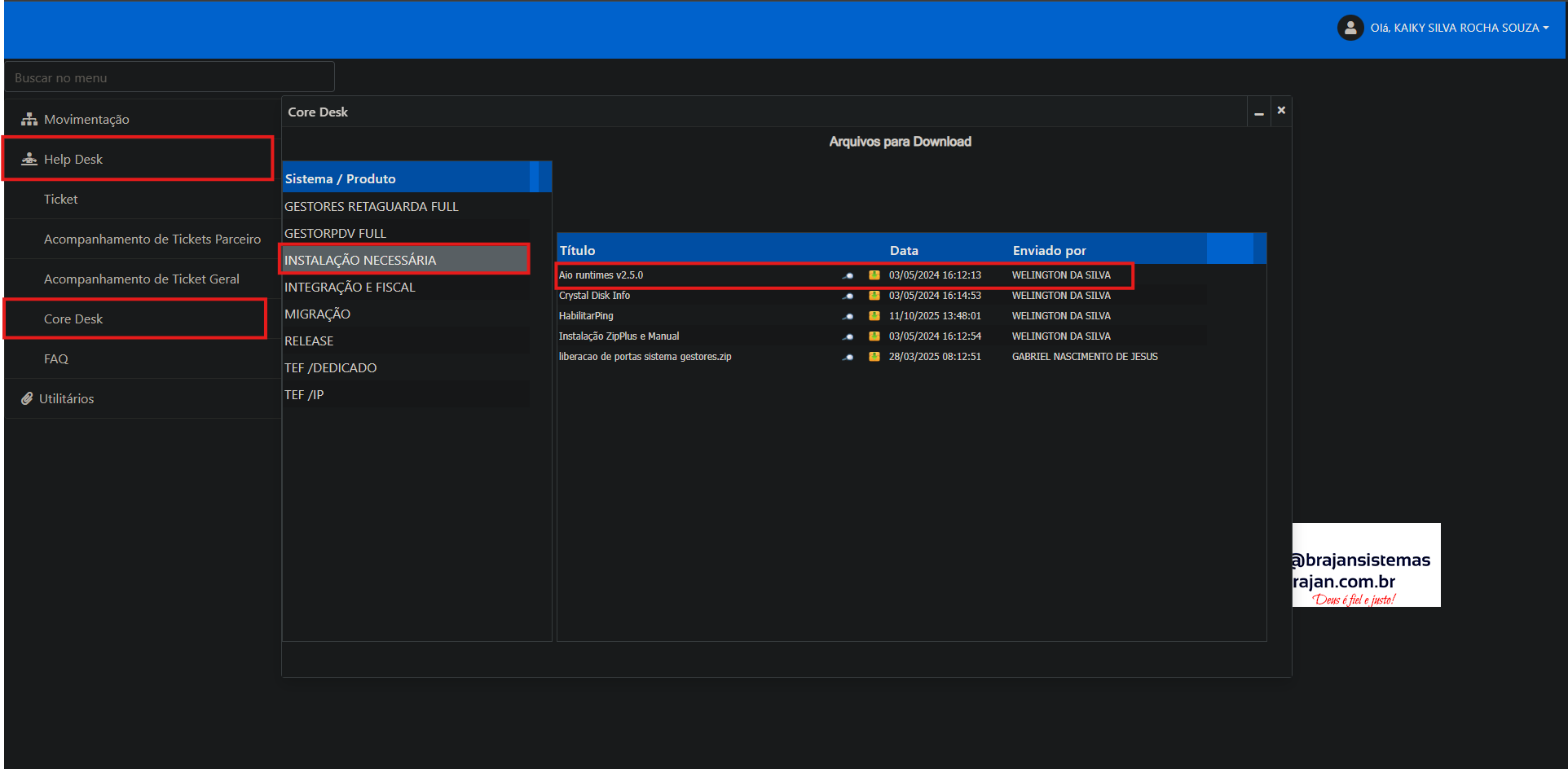 Acesse o menu Help Desk → Core Desk → Instalação Necessária → Aio runtimes v2.5.0