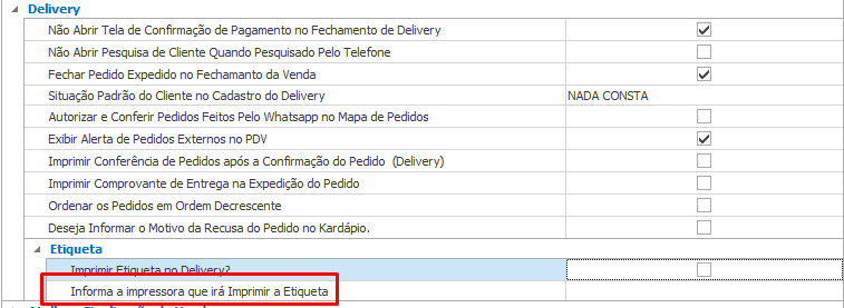 Essa configuração define qual impressora será utilizada para imprimir as etiquetas de delivery.