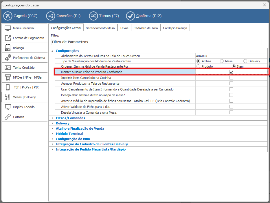 • Quando o parâmetro estiver ativo, o sistema irá identificar o produto de maior valor dentro do combinado e utilizar esse valor como base, distribuindo-o entre os itens do combinado, de forma que o valor total seja equivalente ao valor do produto mais caro.