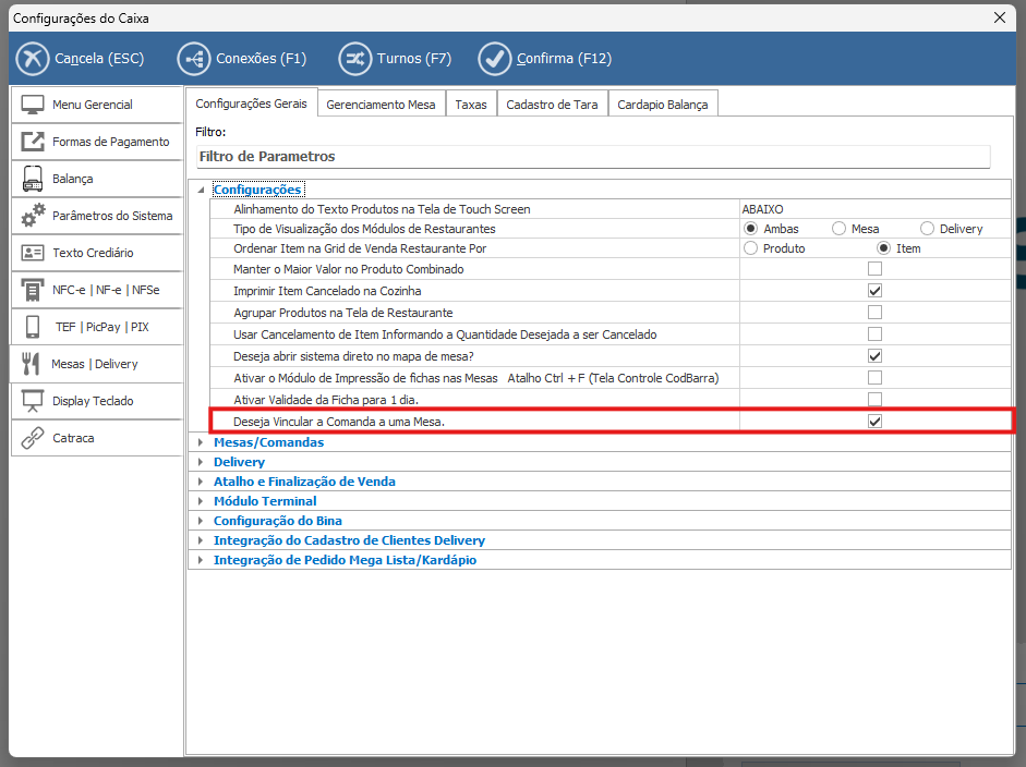 - Este parâmetro define se será possível realizar o vínculo entre comanda e mesa dentro do módulo de atendimento.