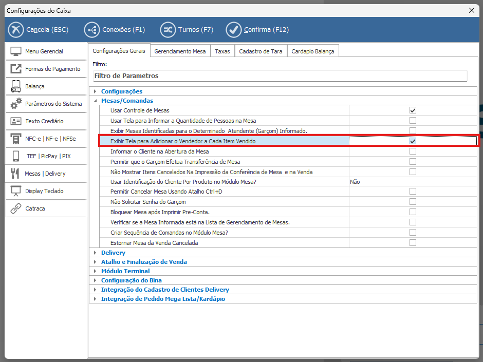 • Este parâmetro define se o sistema deverá solicitar a identificação do vendedor (garçom) responsável no momento da venda.