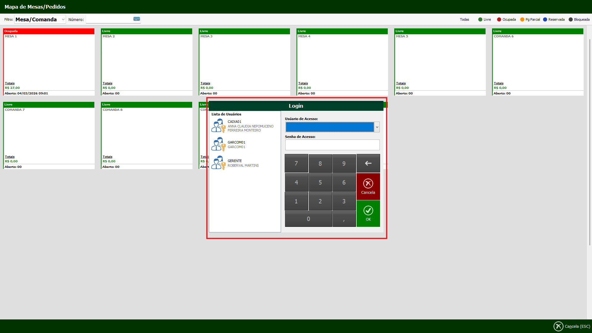 • Ao abrir a mesa, o sistema exibirá uma tela para informar o vendedor (garçom) responsável pelo atendimento. O garçom informado ficará vinculado aos itens lançados na venda, permitindo controle individual, relatórios e cálculo de comissões.
