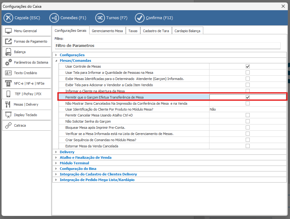 - Este parâmetro define se o garçom terá permissão para realizar a transferência de uma mesa para outra dentro do módulo de restaurante.