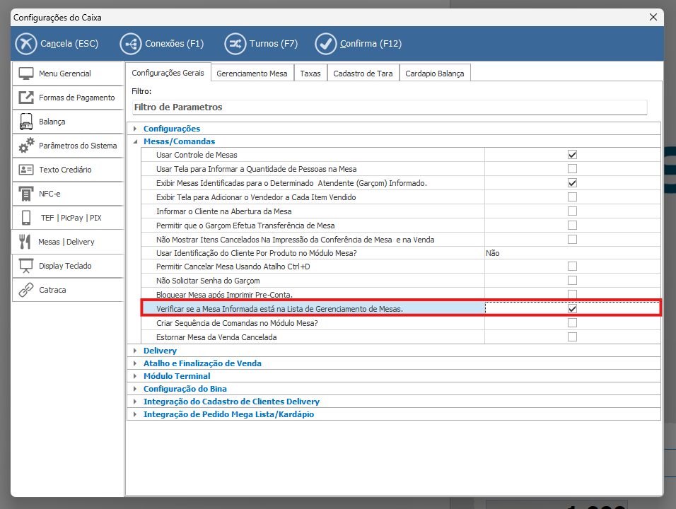 • Este parâmetro define se o sistema irá validar se a mesa informada no atendimento está cadastrada na lista de gerenciamento de mesas do sistema.