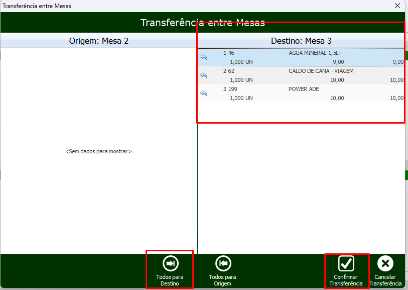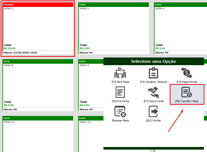 Pressione a tecla F8 ou clique na opção Transferir Mesa.
