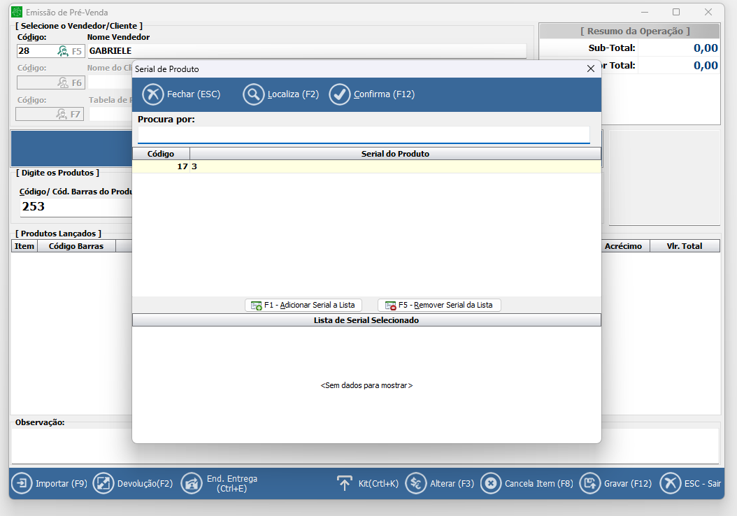 O que faz? Define se o sistema permitirá a consulta de números de (serial) dos produtos durante o processo de venda, pré-venda ou orçamento.