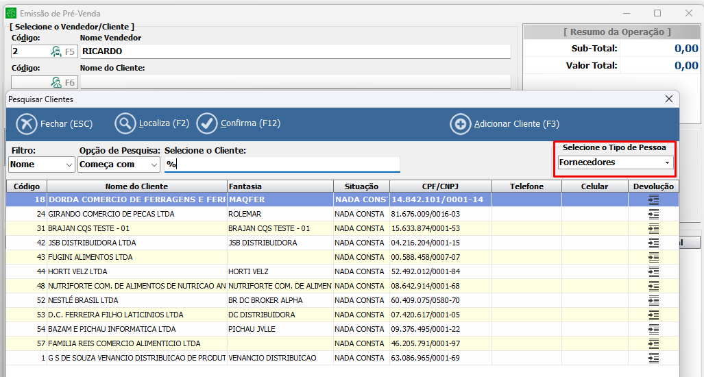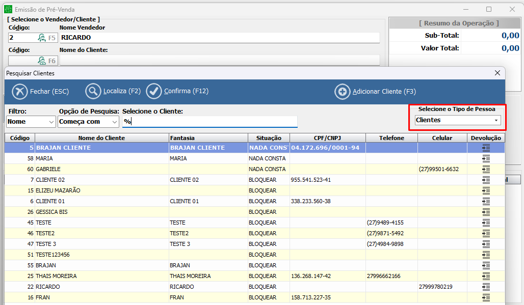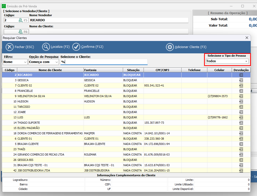- Exibe apenas cadastros do tipo cliente;